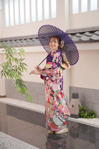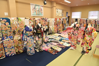 振袖や羽織袴などがずらりと並ぶこの着物館は、なんと100畳を超える広さ。成人式の衣裳や小物を合わせて常時2,000点以上展示しており、いつでもご覧いただけます。