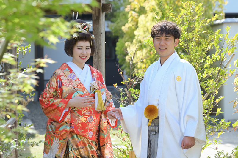 新郎新婦の衣裳(羽織袴、打掛)とお支度付き。豊富な衣裳から友禅作家の打掛も選べます。