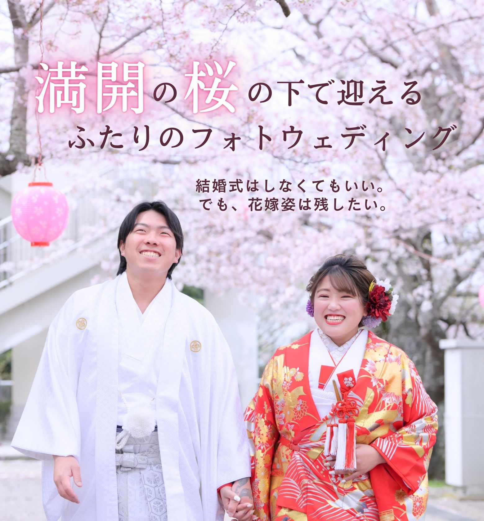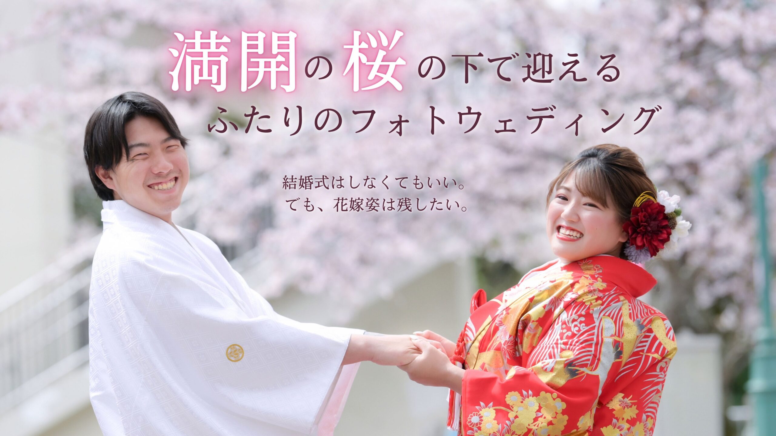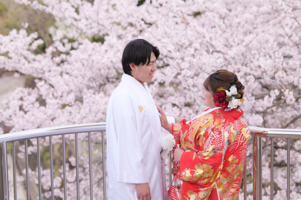 新郎新婦の衣裳、お支度、出張撮影、データ50カット、スタジオでの撮影写真1枚が含まれた、桜の時期だけに叶う特別なプランです。