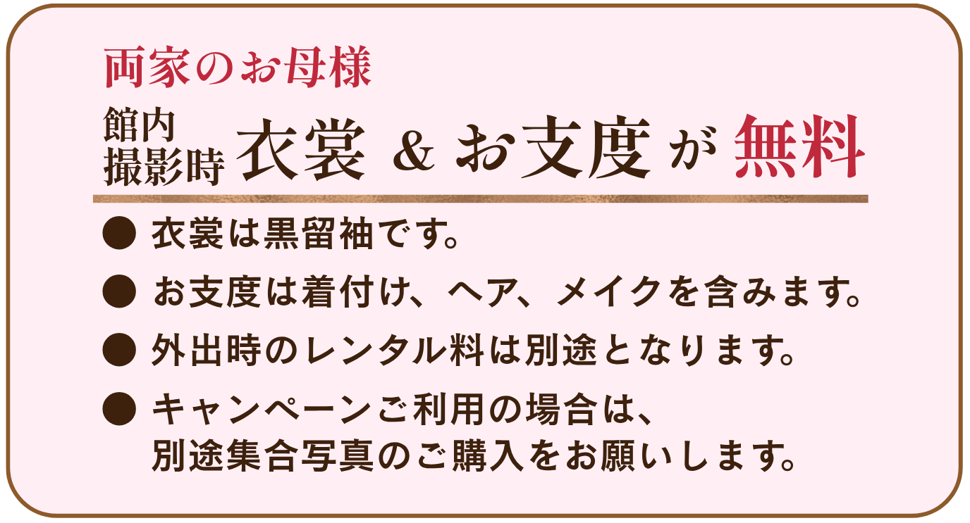 ● 両家お母様の衣裳(黒留袖、館内撮影用)、お支度(着付、ヘアセット、メイク)が無料